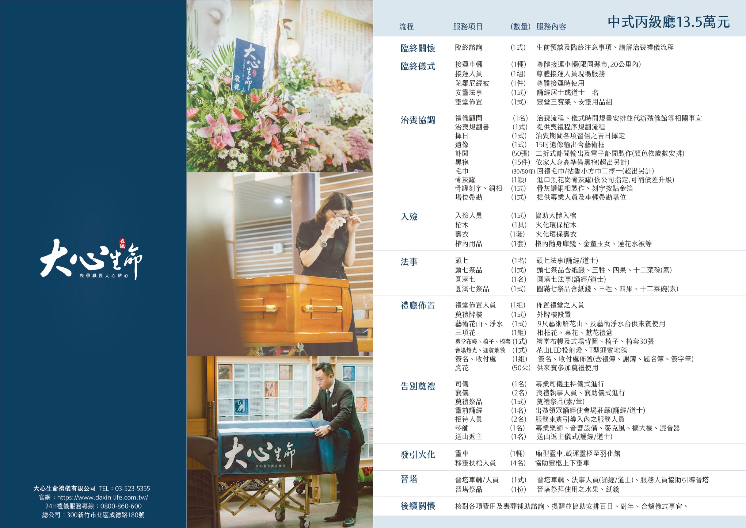 適用與會人數30人以下之服務契約單。提供9尺藝術花山、頭/滿七法事、司儀/琴師/禮生等內容。